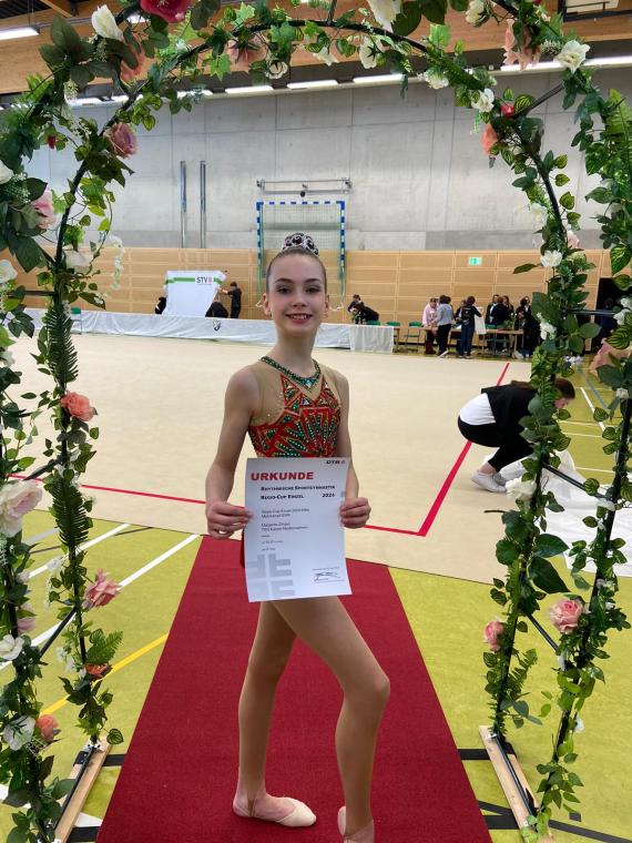 Die 11-jährige Margarita Zimpel, SWK 10-12 Jahre, musste einen 3-Kampf in ohne HG, Reifen und Ball absolvieren und trat gegen 18 Mitkonkurrentinnen an. Es war das 1. Mal, dass sie auf Bundesebene in einem Einzelwettkmpf startete. Das hat sie gut gemeistert und konnte sich über einen tollen 6. Platz freuen. In ihrer Übung ohne Handgerät erhielt sie sogar die 3.-beste Bewertung. Das zeigt ihre schon sehr gute Präsenz auf der Wettkampffläche, was die Kampfrichterinnen honorieren. Es siegte Eva Stele von der TSG Neu-Isenburg. Auf Platz 2+3 kamen zwei Gymnastinnen aus Leverkusen. Diese 3 Gymnastinnen haben sich für den Deutschland-Cup qualifiziert.